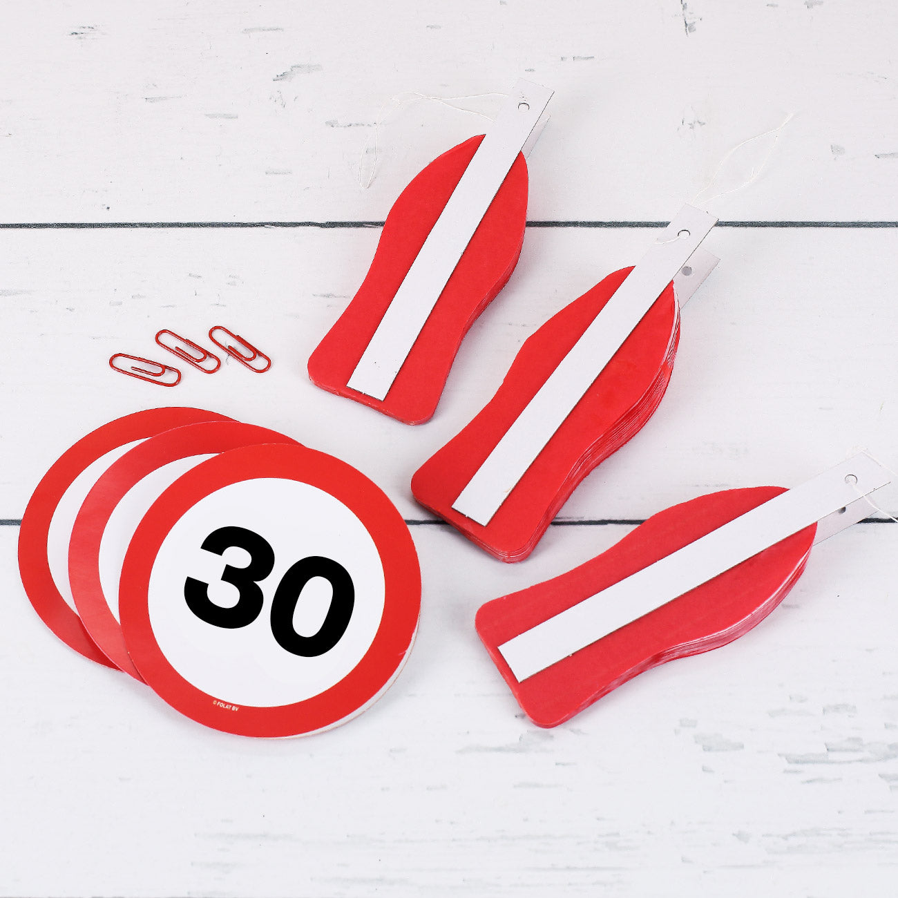 Was aussieht wie eine kompliziert zusammengebastelte Geburtstagsblume, entpuppt sich hier als kinderleicht zusammenzufügende Wabe zum 30. Geburtstag! Die insgesamt drei Waben tragen als Erkennungsmerkmal ein weiß-rotes Verkehrszeichen in der Mitte, das das Alter des Geburtstagskindes angibt. Mit einem Faden ausgestattet, lassen sich die Waben an Decken und Wänden befestigen. Für eine auffällige und feierliche Geburtstagsdekoration!