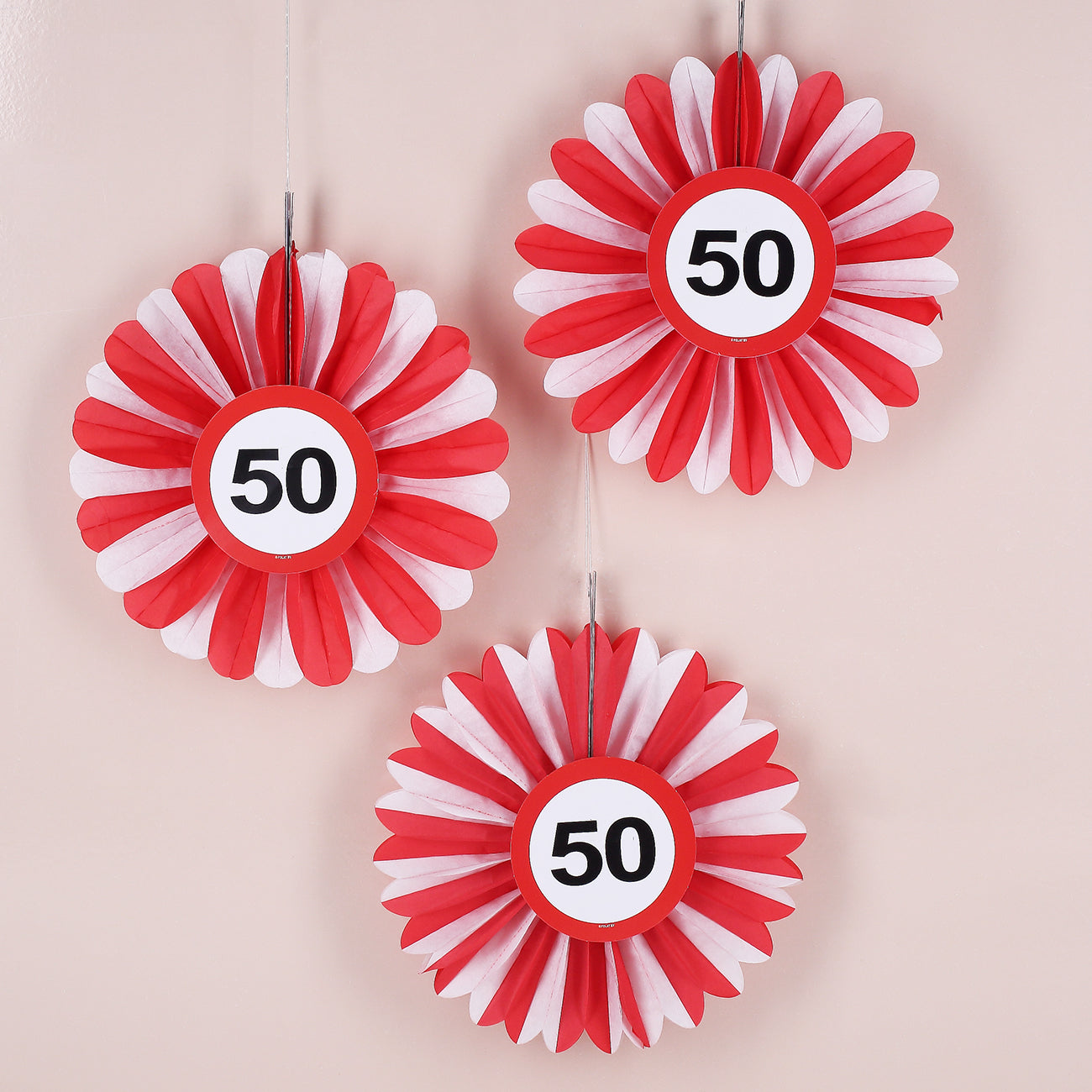 Neben Tischdekoration gehört zum 50. Geburtstag auch etwas Deko an die Wände: mit diesen drei Waben erstrahlen auch diese im Geburtstagsglanz! Rot-weiß gestaltet und mit einem Verkehrszeichen versehen, gehören die Waben zur Sorte schnell gebastelter Geburtstagsaccessoires, was ihrer Wirkung allerdings nicht im Weg steht. Sie können auch als Überraschung für das Geburtstagskind dienen!