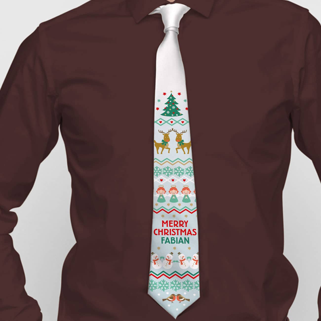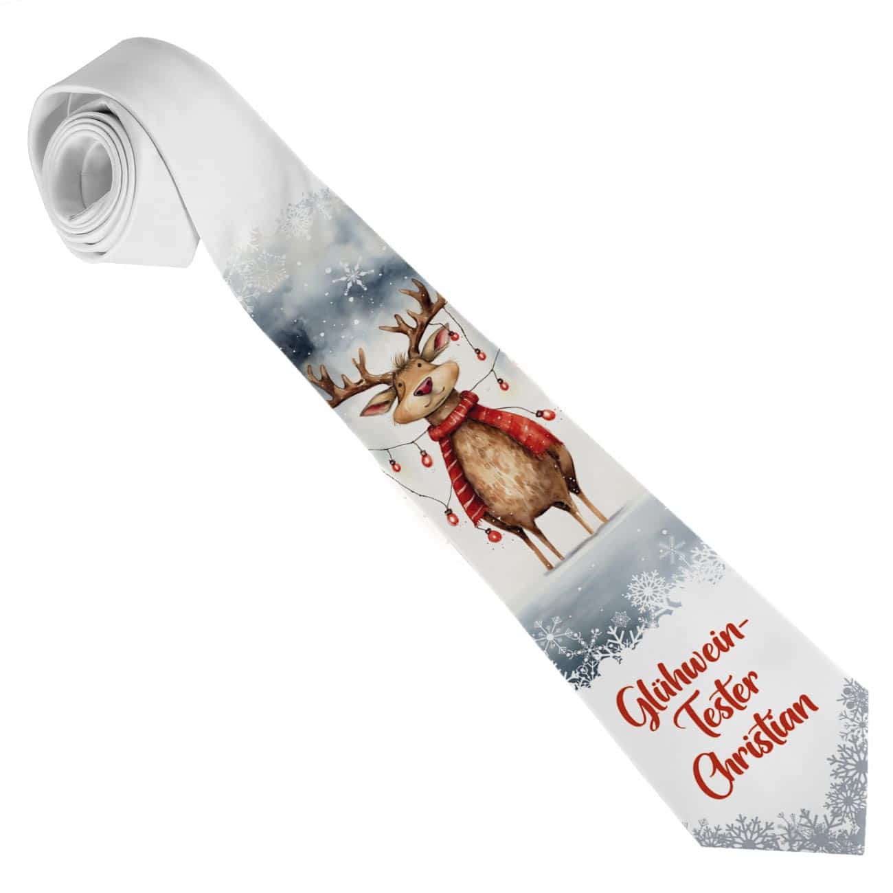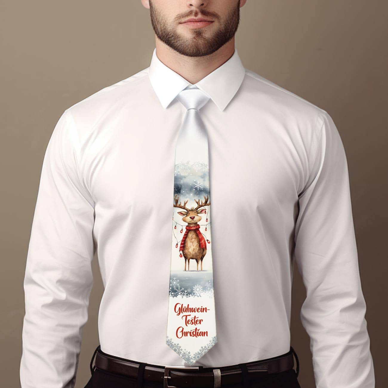 Verleihen Sie Ihrem Weihnachtsoutfit eine ordentliche Prise Spaß und Festlichkeit mit dieser Weihnachtskrawatte im Ugly Sweater Look! Diese einzigartige Krawatte zu Weihnachten wird nach Ihren Wünschen personalisiert und bringt den charmanten und verspielten Stil der beliebten Ugly Christmas Sweater in Ihr festliches Ensemble. Dabei haben Sie die Auswahl aus drei witzigen Motiven. Egal, ob Sie auf der Weihnachtsfeier, beim Familienessen oder im Büro glänzen möchten, diese bunte Weihnachts-Krawatte wird sicherlich alle Blicke auf sich ziehen. Überraschen Sie damit auch gerne jemanden zum Nikolaus, zu Weihnachten oder beim Wichteln.