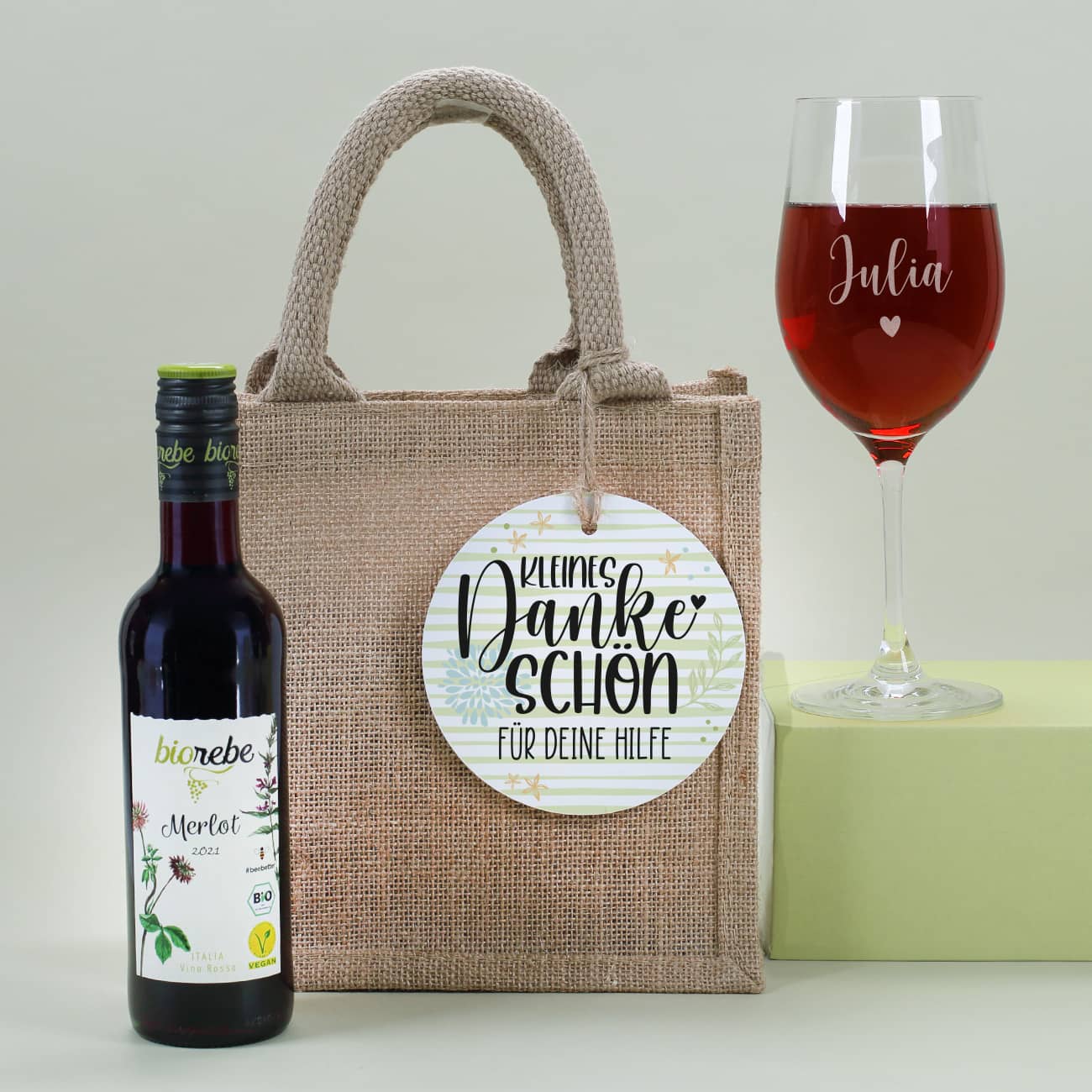 Zeigen Sie Ihre Wertschätzung mit unserem Wein Geschenkset als kleines Dankeschön. Dieses liebevoll gestaltete Set besteht aus einer Biorebe Weinflasche, wahlweise als Rot- oder Weißwein, einem gravierten Weinglas von Leonardo und einer charmanten Jute-Geschenkverpackung. Der beigefügte Anhänger am Jutebeutel mit dem Aufdruck "Kleines Dankeschön" und einem individuellen Namen verleiht diesem Set eine persönliche Note. Dieses personalisierte Geschenkset ist perfekt geeignet, um Ihre Anerkennung und Dankbarkeit auszudrücken. Egal, ob für die beste Freundin, eine liebe Kollegin oder jemanden, den Sie schätzen – dieses Dankeschön Geschenk ist eine liebevolle Geste.