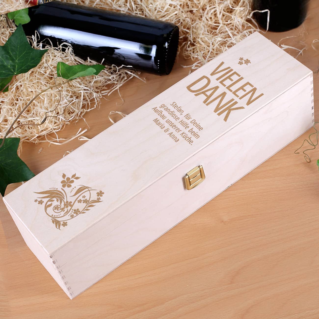 Ob für die Hilfe beim Umzug, oder die Pflege der Haustiere während der Urlaubszeit - immer wenn Sie großzügige Hilfe erfahren haben ist ein persönlicher Dank angebracht. Bei dieser Holzbox gravieren wir Ihren selbst formulierten Text unter die Worte VIELEN DANK. Ergänzt werden diese Angaben von floralen Ornamenten.