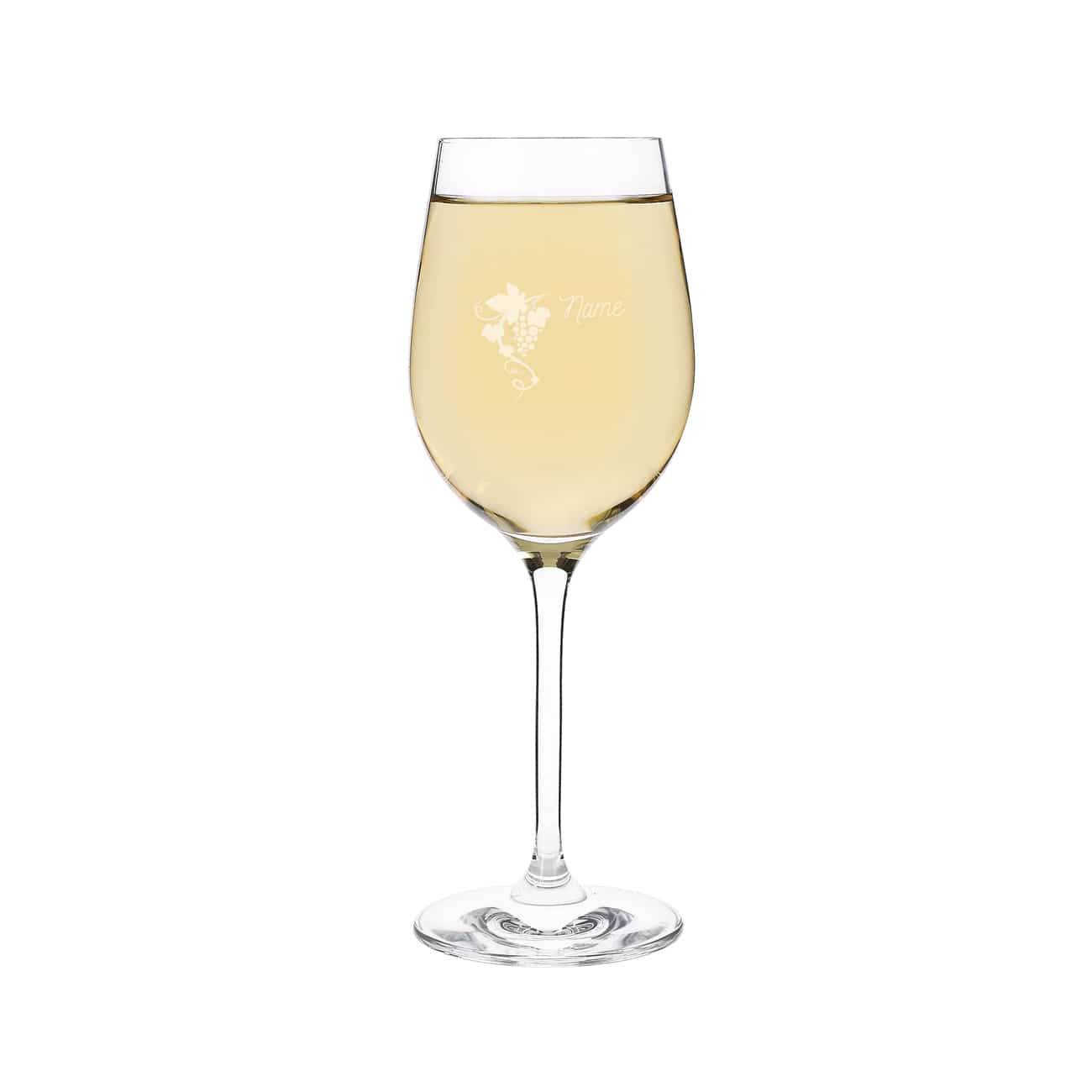Weißweinglas graviert mit Weintraubenranke und Name von Leonardo
