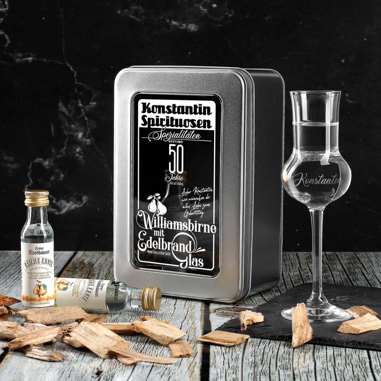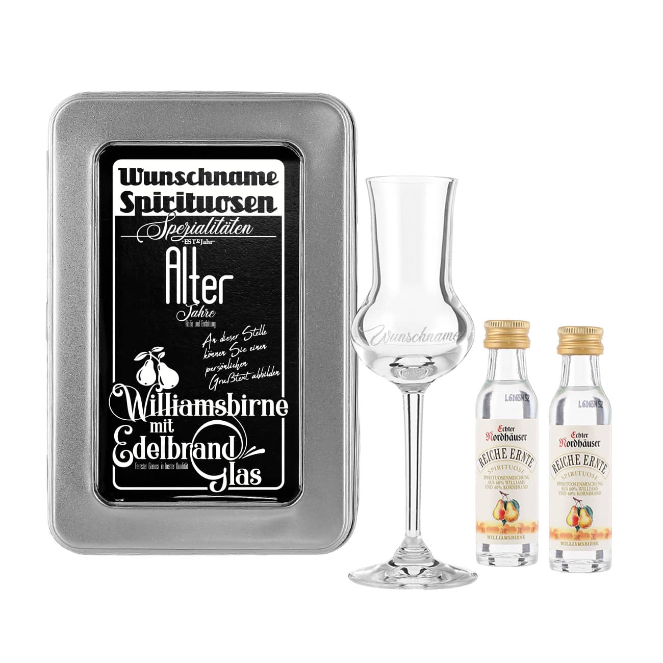 Schnaps Geschenk-Set mit graviertem Edelbrandglas und 2 Williamsbirne Fläschchen in bedruckter Metallschachtel