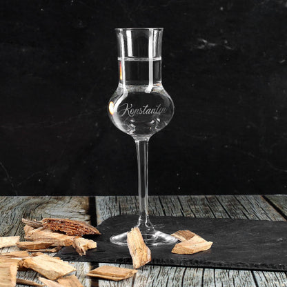 Dieses besondere Glas ist ein Edelbrandglas, mit dem man edle Spirituosen oder, wie es der Name bereits erahnen lässt, besondere Edelbrände optimal genießen kann. Das Schnapsglas besitzt eine bauchige Form, die dazu führt, dass sich die eingefüllte Spirituose über eine möglichst große Oberfläche noch besser entfalten kann. Denn nicht nur der Geschmack und der anschließende Abgang des Edelbrandes sind ein Genusskriterium sondern auch der Geruch bzw. Duft, der vor und beim Trinken in die Nase steigt. Das Edelbrandglas besitzt einen zarten, langen Stiel. Somit wirkt es nicht nur elegant und schlicht, es kann dadurch auch einfach und sicher in der Hand gehalten werden. Auf den Bauch des Schnapsglases wird Ihr Wunschname in einer frischen, geschwungenen und modernen handschirftlichen Schreibschrift einmalig, das heißt einseitig, in einer dezenten Größe graviert.