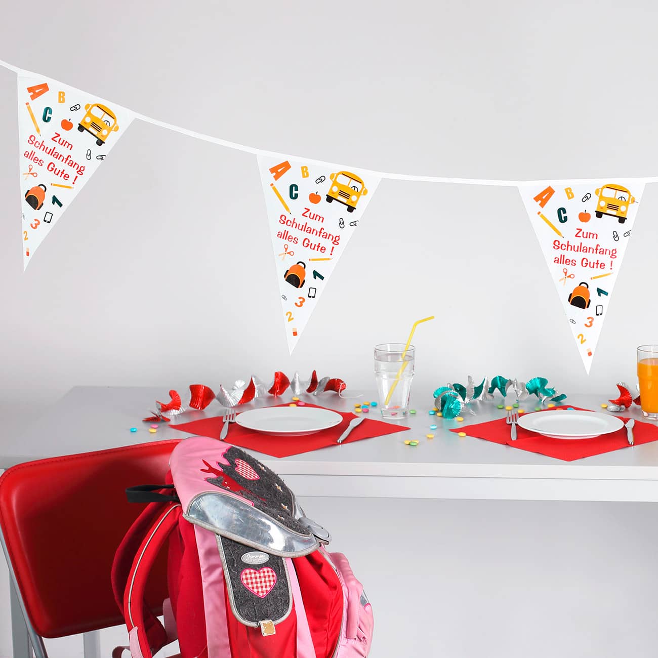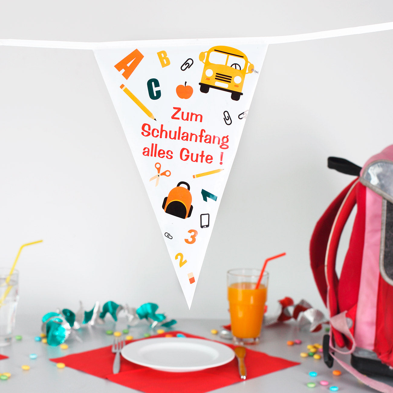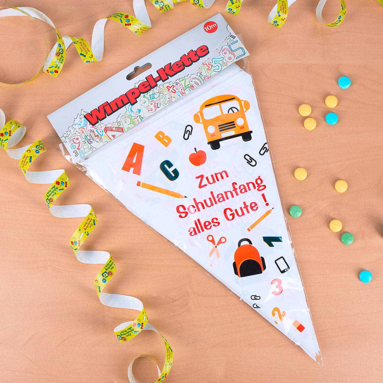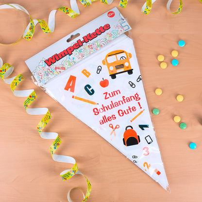 "Zum Schulanfang alles Gute!" - steht auf 15 Wimpel, die mit bunten Schulmotiven verziert sind. Mit der Kette zaubern Sie eine tolle Partydekoration zur Einschulung von einem kleinen abc Schützen.