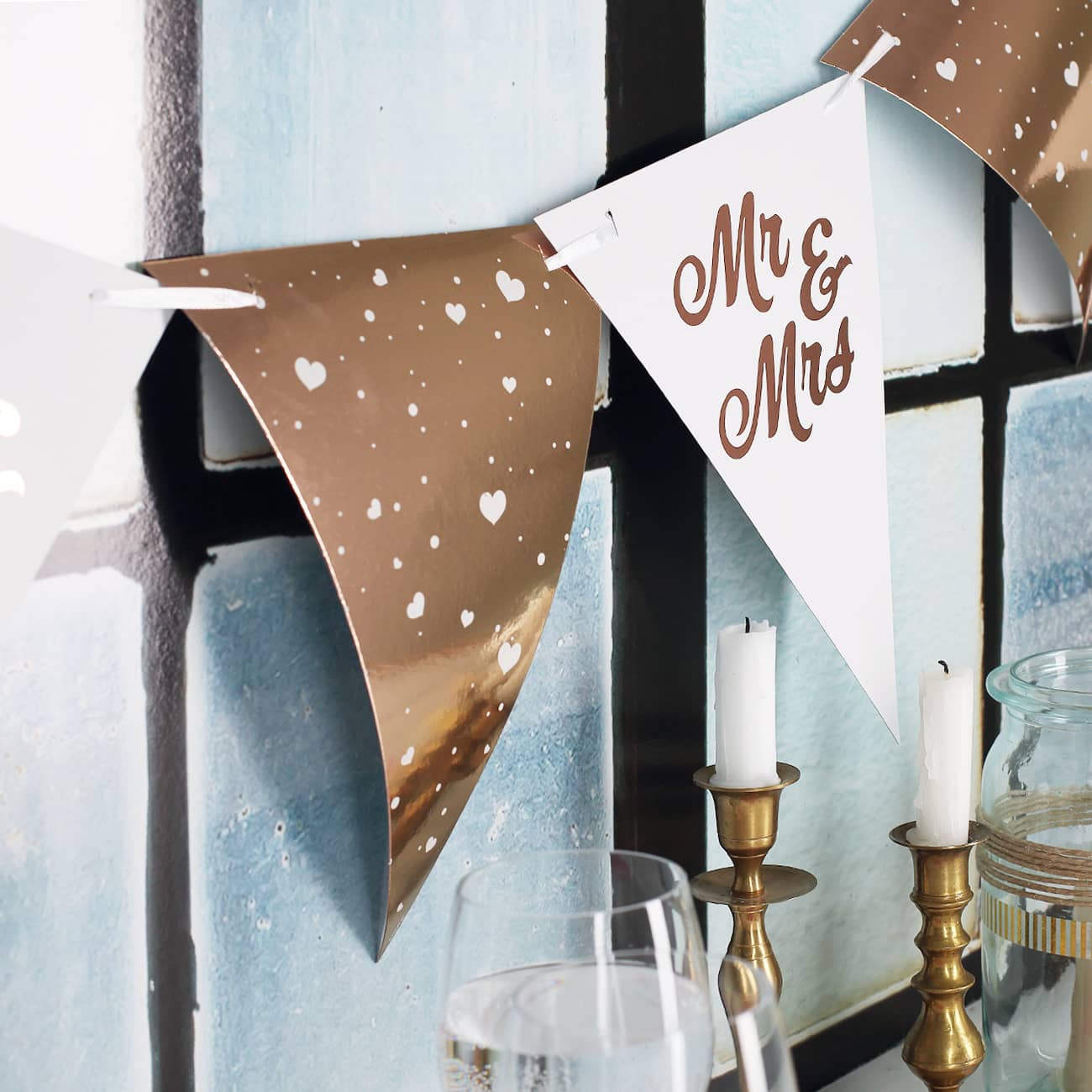Diese schöne Wimpelkette verleiht Ihrer Hochzeitsdekoration Glanz und Romantik. 10 Wimpel können auf 6 m individuell verteilt werden. Die einzelnen Wimpel bestehen aus Papier und glänzen in einem modernen roségold. Abwechselnd können die Wimpel mit dem Schriftzug Mr & Mrs und mit kleinen verspielte Herzen auf das Band gezogen werden. Der goldene Effekt steht dabei im Vordergrund.