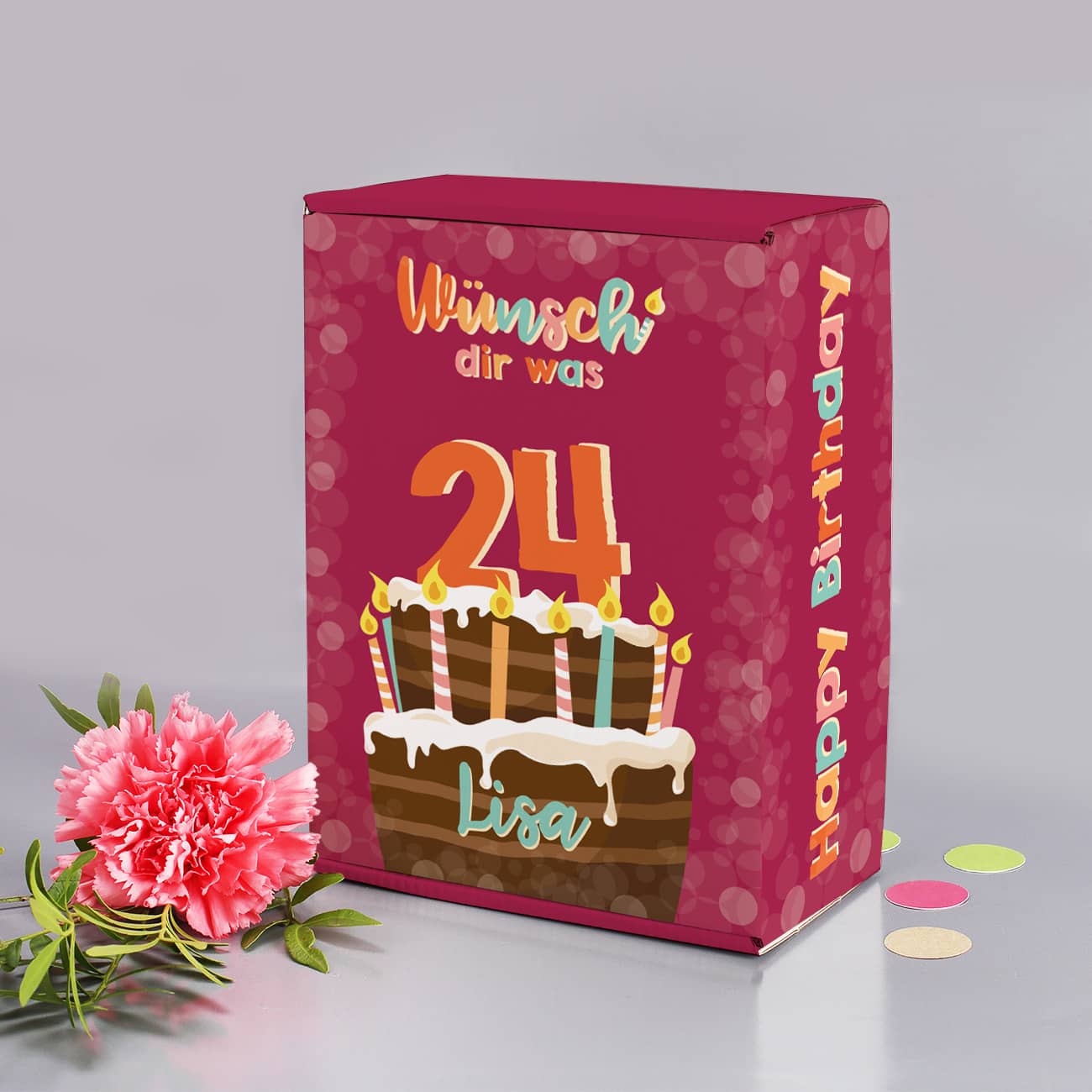 Diese praktische Geschenkbox ist nicht nur funktional, sondern auch liebevoll gestaltet. Sie wird mit Ihren Wunschangaben personalisiert, die der Name und das Alter des Geburtstagskindes sind. Die festliche Aufschrift "Wünsch dir was!" und das Motiv einer Geburtstagstorte verleihen der Verpackung einen fröhlichen und festlichen Touch. Das Wunschalter wird geschickt in die Kerzen der Torte integriert, was diese Geschenkbox zu einem einzigartigen Geburtstagsaccessoire macht.