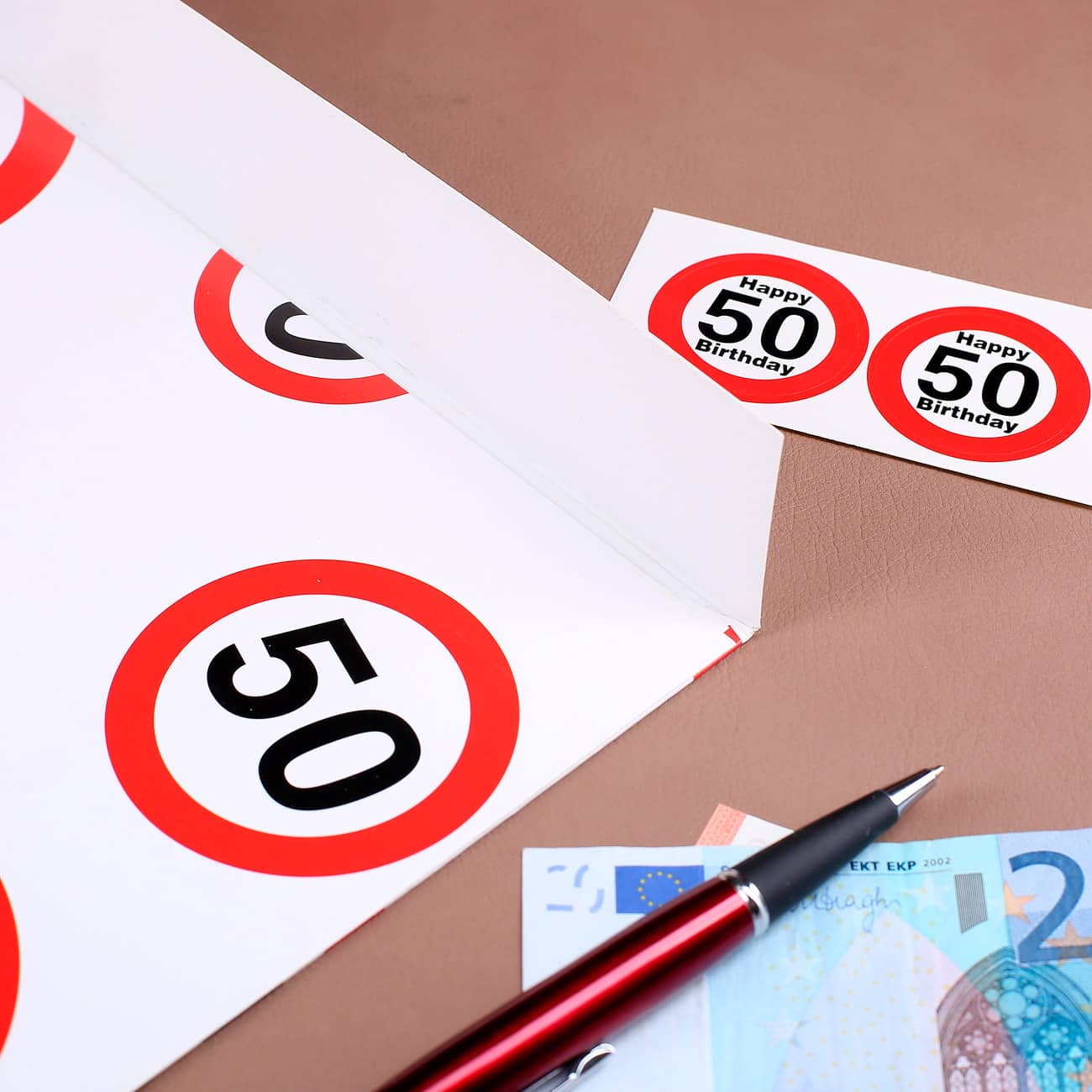 Geldgeschenke sind zu Geburtstagen sehr beliebt und daher haben wir hier eine originelle Verpackung für Ihr Geldgeschenk zum 50. Geburtstag. Der XXL Briefumschlag kann als Geldgeschenk zum 50. Geburtstag verwendet werden. Die Karte aus Pappe im Inneren bietet viel Platz für Ihre Glückwünsche und Sprüche an das Geburtstagskind. Dort können Sie auch die Geldscheine oder andere Kleinigkeiten befestigen. Die zwei mitgelieferten Sticker mit Verkehrszeichen Motiv können zusätzlich zur Gestaltung der Karte genutzt werden.
