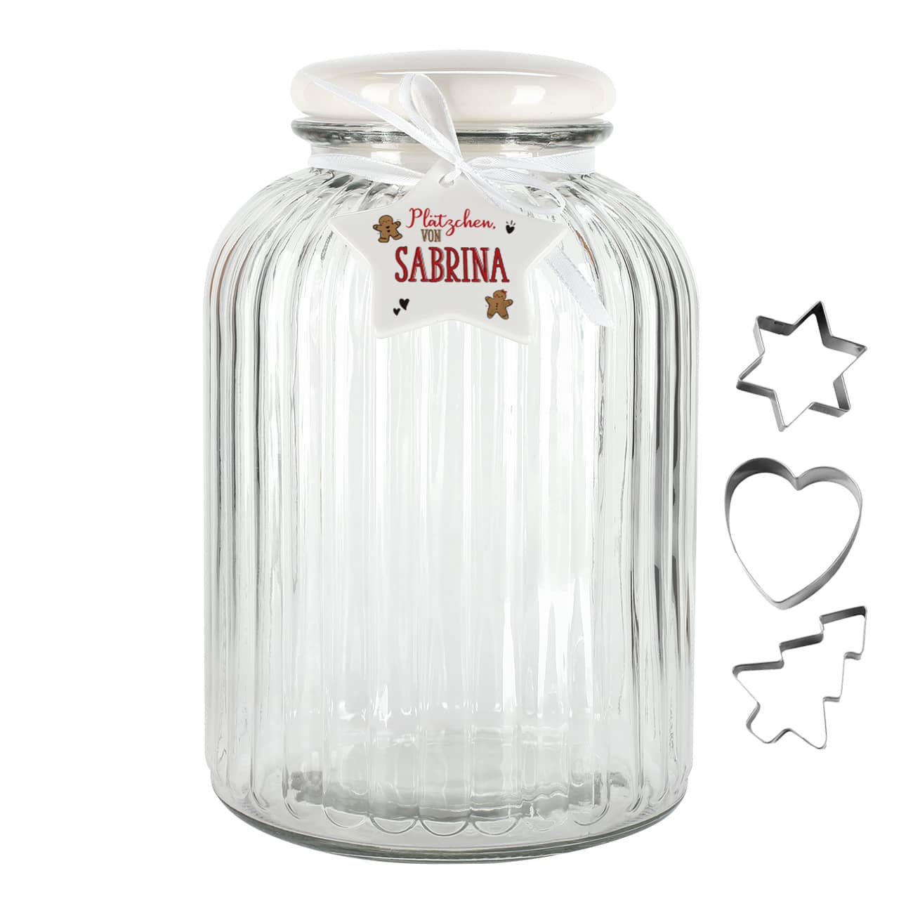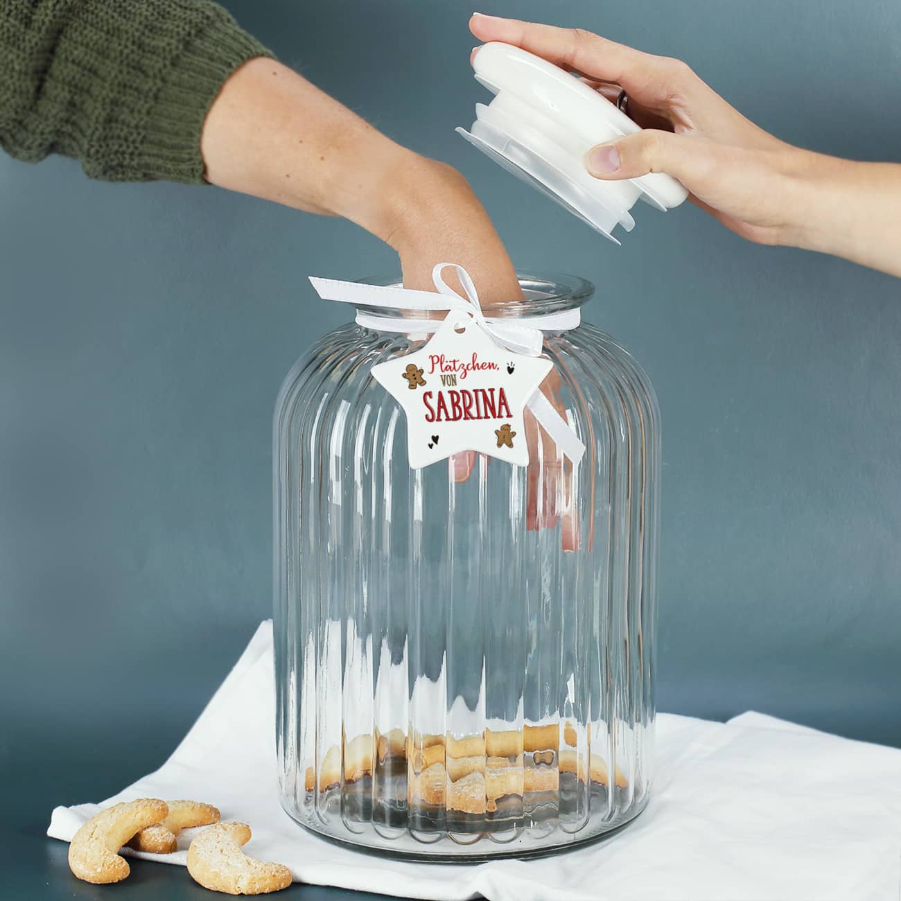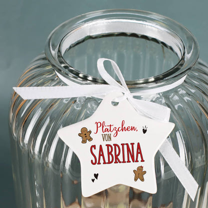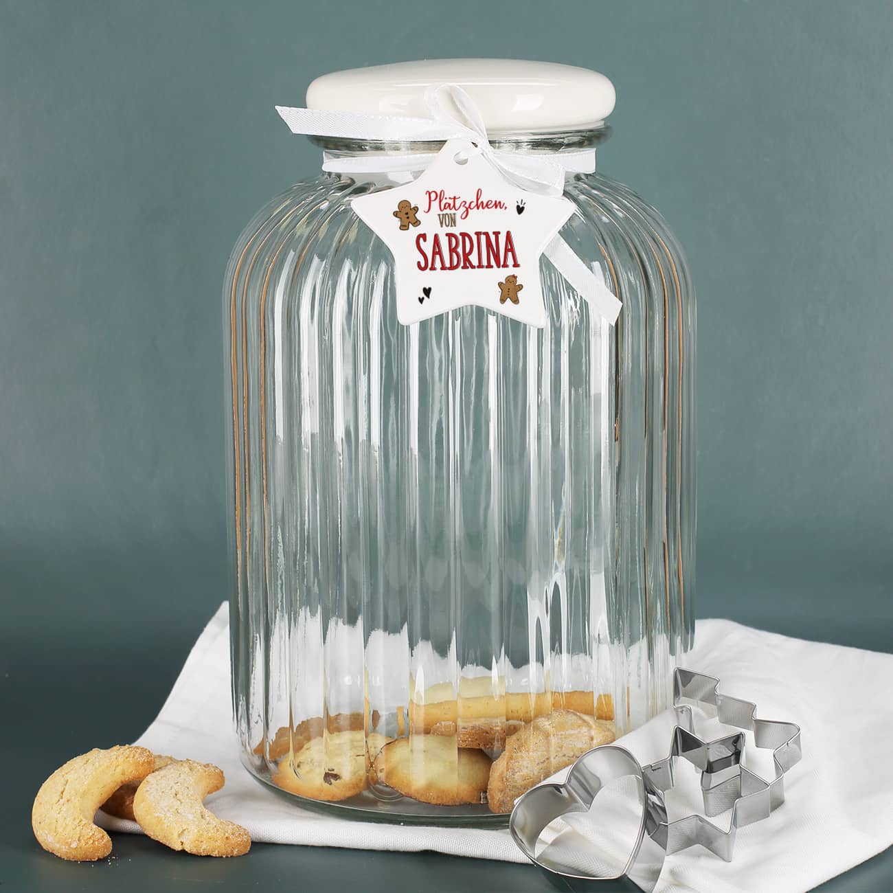 Überraschen Sie leidenschaftliche Bäcker und Bäckerinnen zur Vorweihnachtszeit oder auch zum Weihnachtsfest selbst mit diesem Geschenkset zu Weihnachten! Es besteht aus einer übergroßen Glasdose für Plätzchen, 3 verschiedenen Keksausstechern und einem weißen Keramikanhänger in Sternform, der mit dem Schriftzug "Plätzchen von..." und einem Namen nach Wunsch bedruckt wird. Den Anhänger befestigen wir für Sie mit einer schönen weißen Schleife am Glas. So weiß jeder, um wessen Leckereien es sich in diesem Keksglas handelt! Befüllt werden kann das Keksglas auch direkt mit ein paar Plätzchen und Keksen, damit man kein leeres Keksglas überreicht. In der nächsten Plätzchensaison in der Weihnachtsbäckerei kann dann die Glasdose von der beschenkten Person selbst aufgefüllt werden. Ein tolles Weihnachtsgeschenk für die Küche.