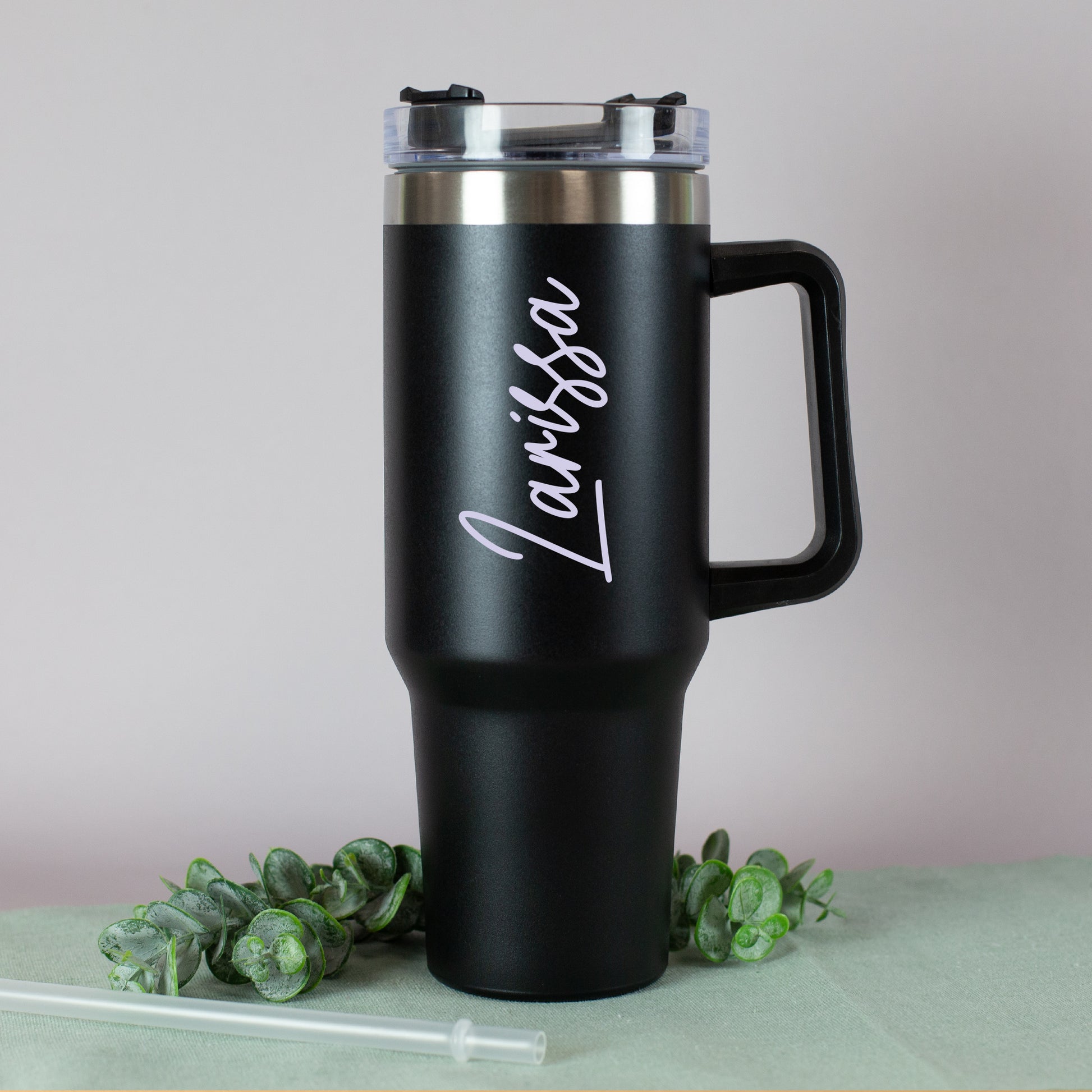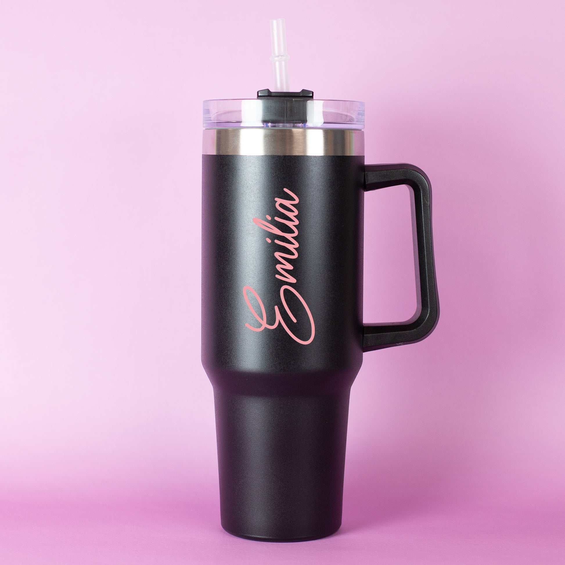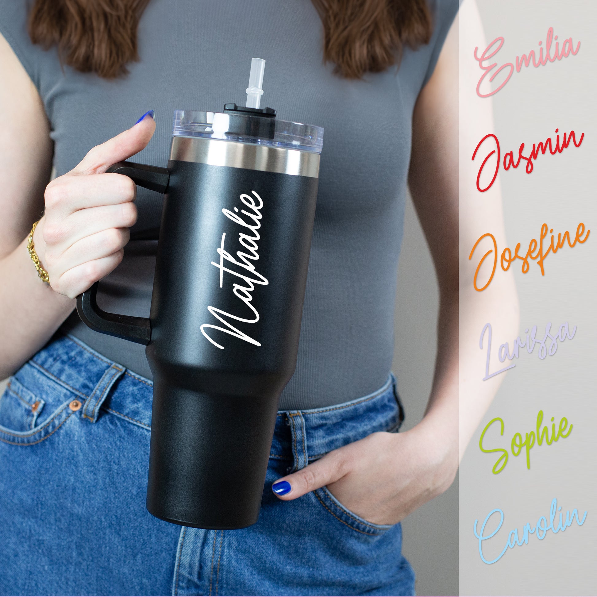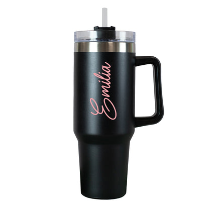 Ein stilvolles Accessoire für unterwegs – dieser schwarze Thermobecher mit einem vertikal gedruckten Namen in eleganter geschwungener Schrift ist der perfekte Begleiter für Alltag, Büro oder Freizeit. Du kannst nicht nur deinen Wunschnamen individuell gestalten, sondern auch aus sieben modernen Schriftfarben wählen – von dezentem Weiß über elegantes Rosa bis zu knalligem Grün oder Blau. Der Name wird beidseitig vertikal auf dem Becher gedruckt und macht ihn zu einem absolut persönlichen Unikat.