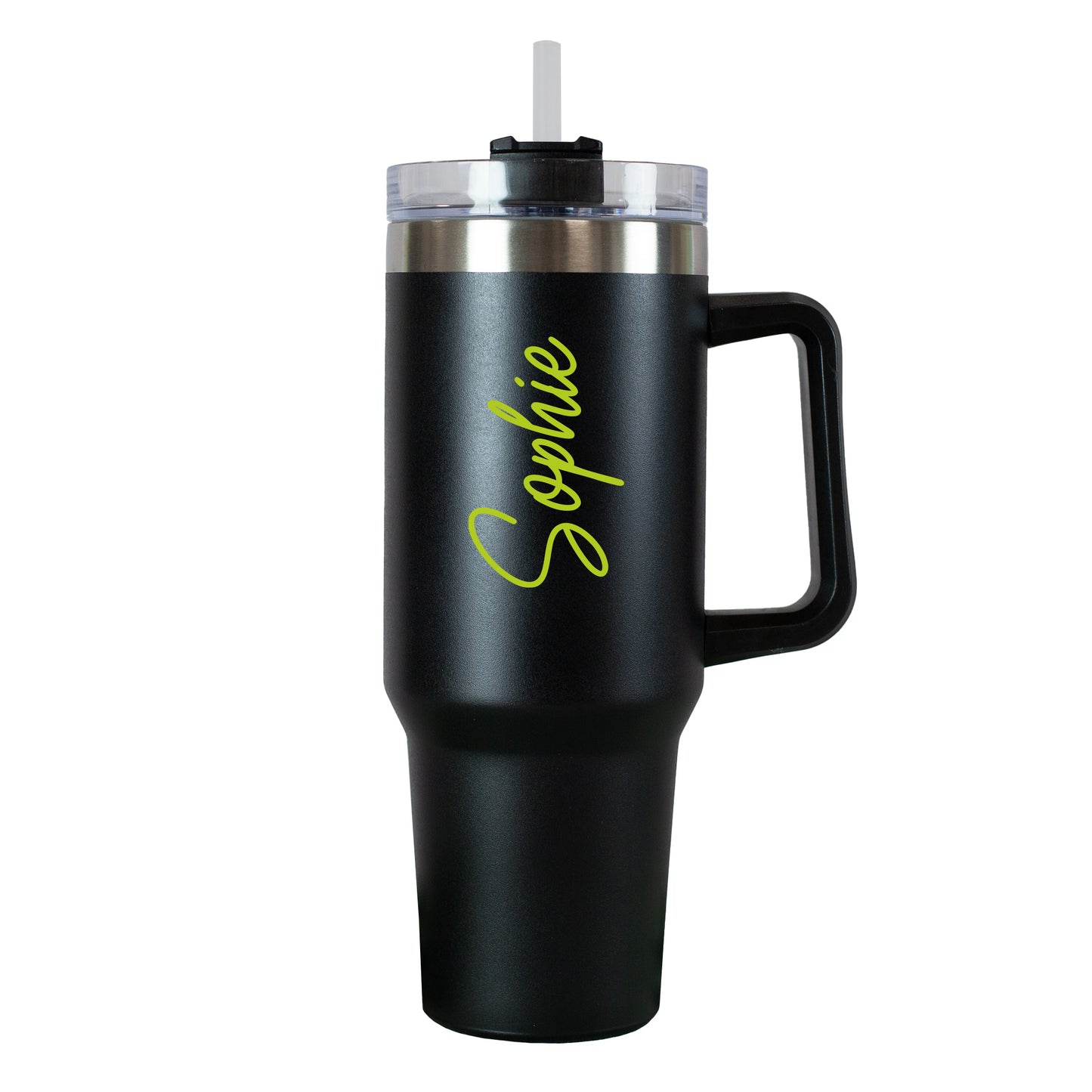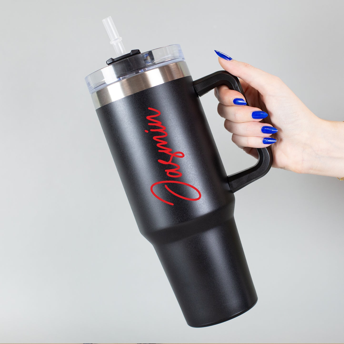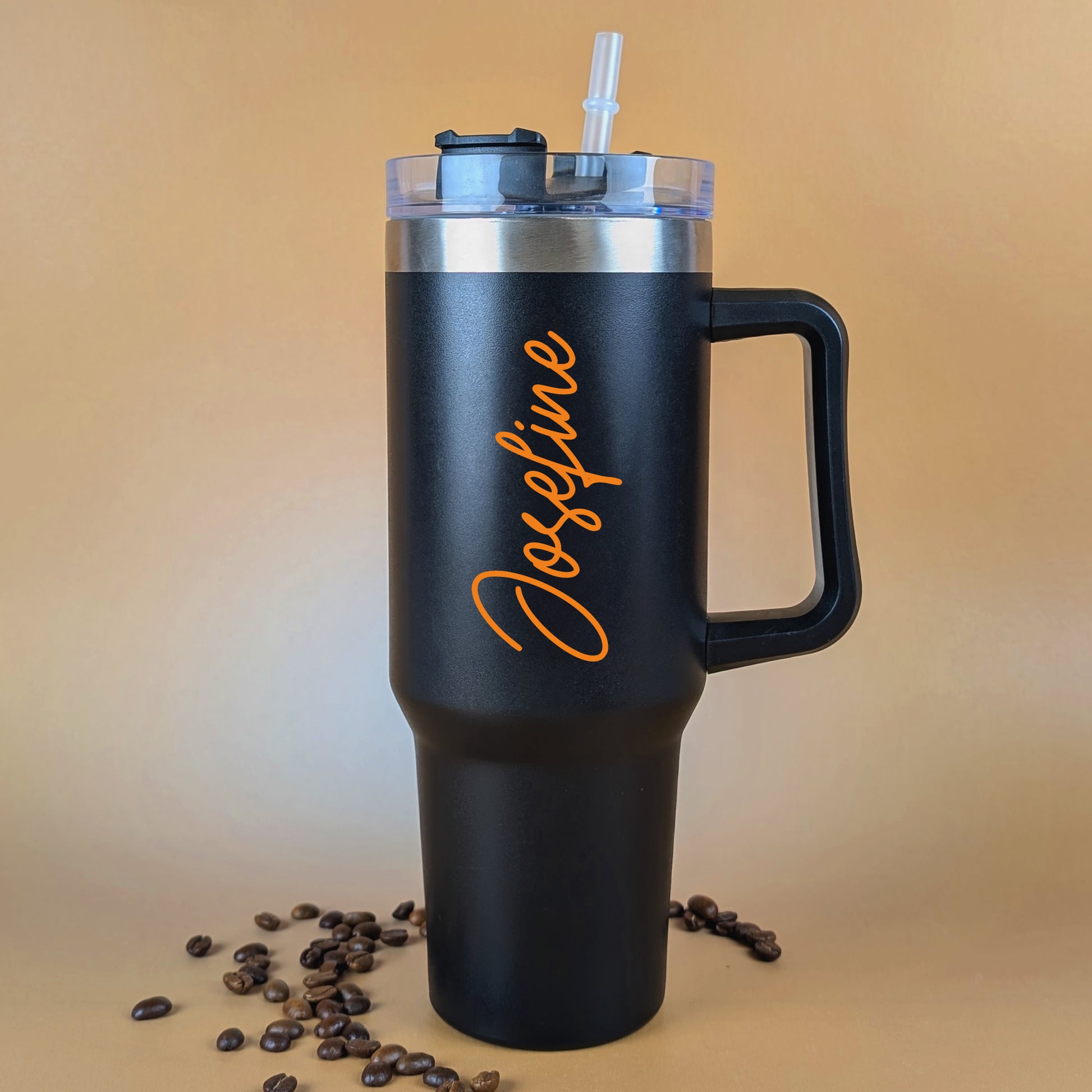 Ein stilvolles Accessoire für unterwegs – dieser schwarze Thermobecher mit einem vertikal gedruckten Namen in eleganter geschwungener Schrift ist der perfekte Begleiter für Alltag, Büro oder Freizeit. Du kannst nicht nur deinen Wunschnamen individuell gestalten, sondern auch aus sieben modernen Schriftfarben wählen – von dezentem Weiß über elegantes Rosa bis zu knalligem Grün oder Blau. Der Name wird beidseitig vertikal auf dem Becher gedruckt und macht ihn zu einem absolut persönlichen Unikat.