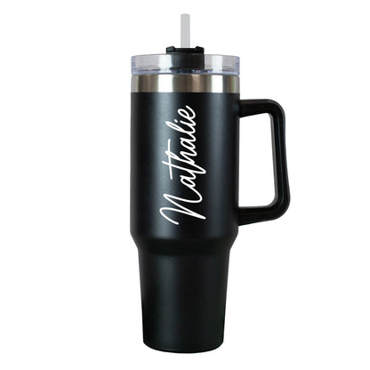 ✔ Personalisierter Thermobecher mit vertikalem Namen in geschwungener Schrift