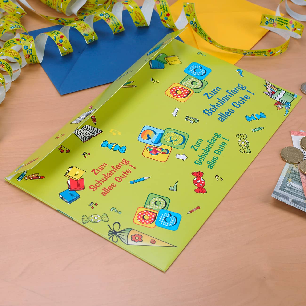Zur Einschulung sind Geldgeschenke eine tolle Idee und mit diesem kunterbunten XXL Umschlag ganz besonders verpackt. Der Umschlag zeigt tolle Schulmotive mit dem Spruch "Zum Schulanfang alles Gute!" und ist von beiden Seiten bedruckt.