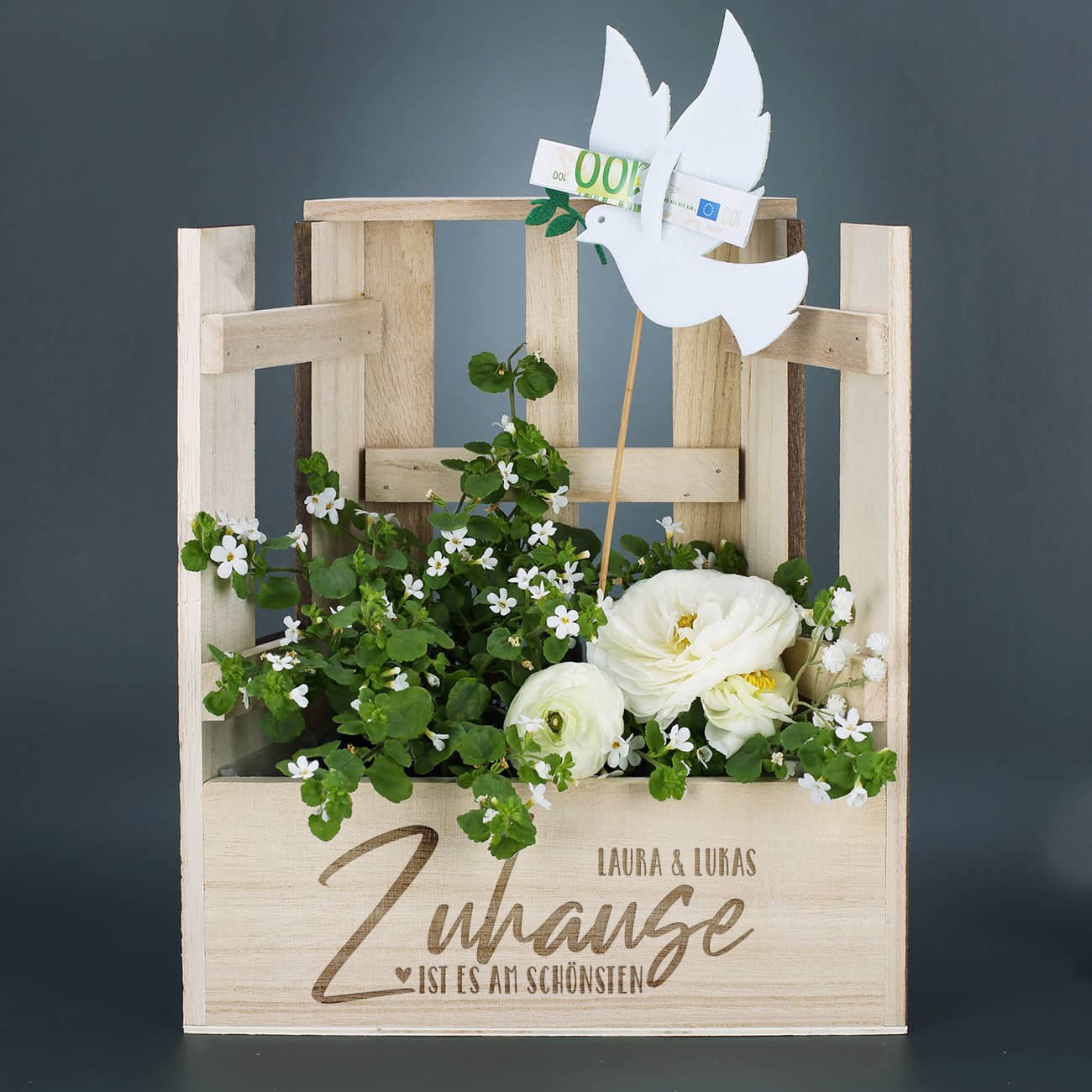Der Pflanzkorb zum Einzug erhält eine individuelle und hochwertige Gravur, die dem Blumenkasten den letzten Schliff verpasst. Es wird ein Text nach Ihrem Wunsch abgebildet, welcher beispielsweise die Namen eines Pärchens oder einen Familiennamen beinhalten kann. Die Schriftzüge werden mit modernen Lasertechniken deutlich und sauber auf dem Holz abgebildet, so dass diese besondere Geschenkverpackung auch qualitativ überzeugen wird. So können Sie wunderbare Geldgeschenke und Geschenke zum Einzug & Hausbau gestalten, die man gerne als Dekoration auf dem Balkon, der Terrasse oder vor der Haustür platziert!