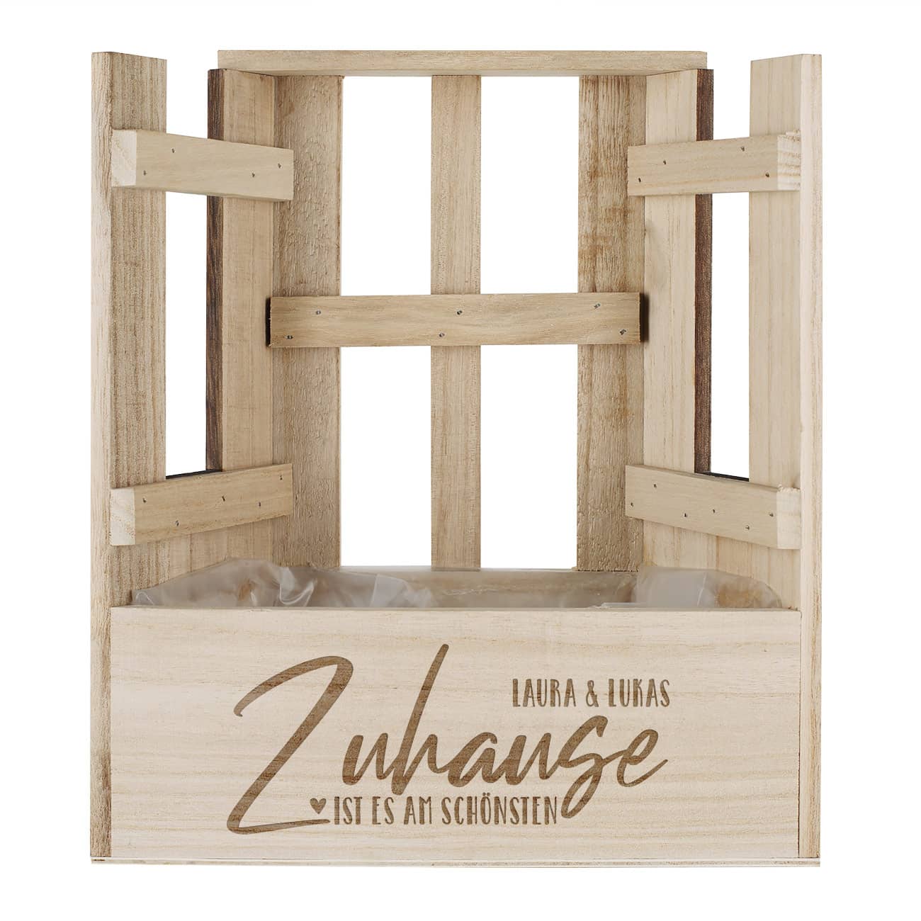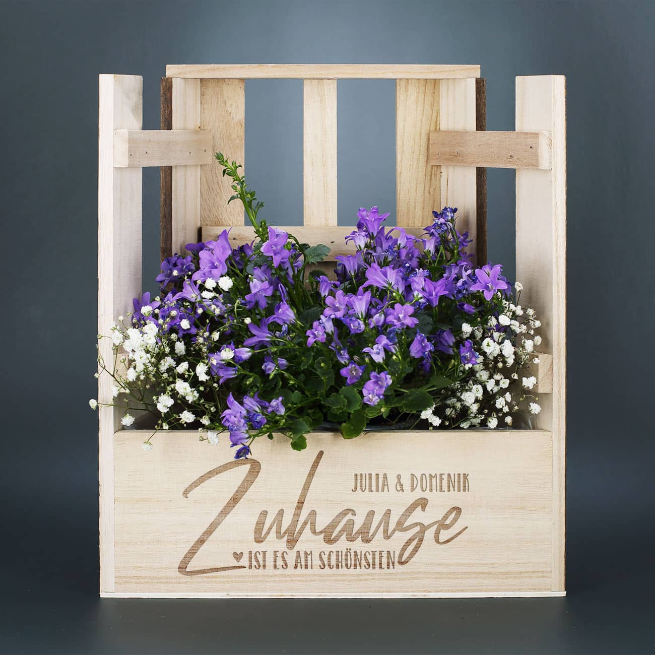 Dieser Pflanzkorb ist ein tolles Präsent zum Einzug und schmückt jeden Eingangsbereich mit dem tollen Spruch "Zuhause ist es am schönsten". Auch zum Hausbau ist er eine schöne Geschenkidee. Sie können den Korb nach Ihren Vorstellungen gestalten und ihn mit allerlei Pflanzen und Dekorationen bestücken. Durch den Zaun eignen sich wunderbar Rankpflanzen für die Pflanzkiste. Wer die Häuslebauer mit einem einzigartigen Geldgeschenk überraschen möchte, kann auch Geldscheine falten und diese an dem Pflanzkorb anbringen. Dank der persönlichen Gravur ist der Pflanzkorb aus Holz eine dekorative Bereicherung für jedes Haus und wertet jede Wohnung charmant auf. Gerne können Sie auch unsere Vorschau nutzen, um sich noch vor dem Abschluss Ihrer Bestellung ein Bild von dem gravierten Pflanzkorb zu machen.